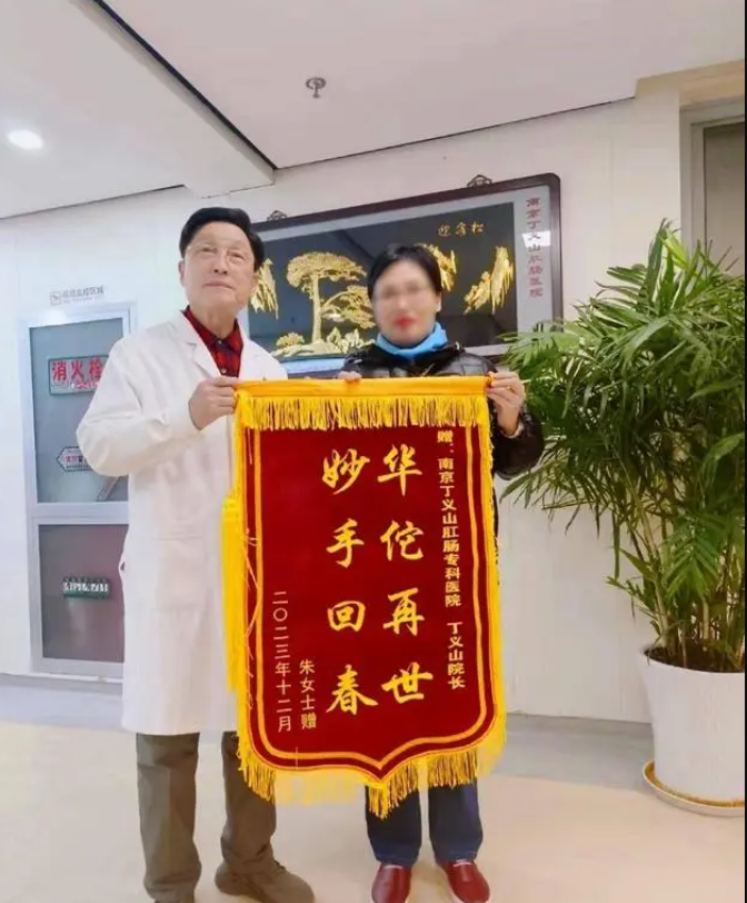 丁院长医术高明,治疗对我帮助很大,一针(丁氏枯痔针)解除我多年的病痛,不用住院,治完就下床回家了。治疗没有疼痛,也没有恐惧紧张,真的神奇,让我病痛完全消除了,生活也正常了。不仅治好了我的病,还让我省了钱,真的非常感谢。老南京人都知道丁院长医术高超、医德高尚,都对他赞不绝口。我送来这块锦旗,希望更多的人能够知道丁义山院长,让更多人从病痛中解脱出来。”