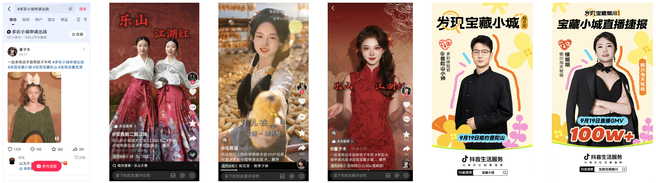 与此同时,更多达人以亲身游历深度体验小城风情,用鲜明个人风格诠释地域特色,构建沉浸式的内容体验,让用户真正“入画”。变装达人们巧妙的将小城本色披上了身。@双胞胎二姐二妹 穿上大红马面裙,演绎豪情万丈的乐山“江湖红;@乌恩温 走入上饶化身晒秋少女,传达丰收的喜悦。@董子木、@言欢、@龙恩星、@奇阿奇等更多达人都纷纷加入,成功点燃众多网友的出行灵感,#多彩小城申请出战 话题热度被点燃,播放量超1200万次。@普陀山小帅作为“出彩体验官”,共同助推小城热度;在“发现宝藏银川”直播中,银川海天牧场@楼姐姐单日直播GMV便突破100W+,进一步放大小城的传播声量。
