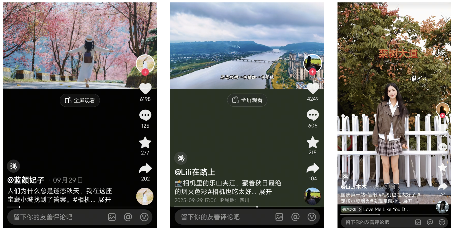 摄影达人则潜入小城的街头巷尾,用镜头构建起烟火气与诗意并存的城市画卷。@蓝颜妃子 行走大理,以野草绿、秋叶黄、湖水蓝、樱花粉的流转捕捉色彩美学,更借过桥米线、喜洲粑粑与菌子火锅传递舌尖风味,引发观众“已定机酒”的即时行动。@Lili在路上 带观众云逛乐山夹江,从非遗年画展、青衣江秋色到一碗泼辣豆腐脑,立体呈现当地的文化厚度。@LiLi木木 则在信阳规划出栾树大道至热干面、固始鹅块的轻旅行路线,以可复制的体验带动用户直接打卡。