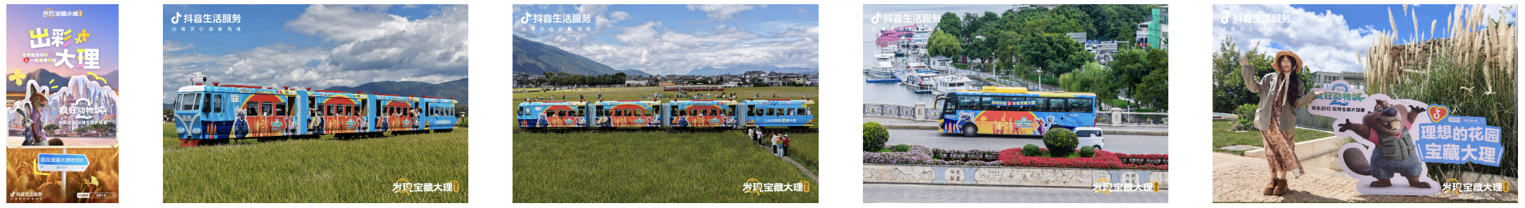 风靡全球的《疯狂动物城2》主角朱迪和狐尼克来到喜洲古镇,宣告续作回归的同时,也为当地带来浓郁的童话气息。为此打造的“疯狂动物城”主题公交旅游大巴和喜洲稻田主题小火车,将动画世界的欢乐氛围融入大理田园风光和日常生活的旅途之中,为游客打造了一场麦田里的童话之旅,成为文旅联动的亮眼案例。同时,活动还设置了角色立牌打卡点供游客打卡留念,极大提升了现场的沉浸感与趣味性。不少游客在此驻足,与角色合影留念并主动在抖音分享,推动#发现宝藏大理 #我们的喜洲时光 等话题迅速升温,播放量分别突破3600万次和480万次,形成一波持续的打卡传播热潮。