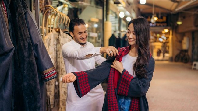 游客可在此换上沙特传统袍服,佩戴头巾拍照留念;也可参与文化工坊,体验阿拉伯书法、陶艺与椰叶编织,亲手制作独具特色的手工艺品。此外,展区还设有以利雅得、德拉伊耶、吉达、红海和埃尔奥拉五大目的地为灵感的多媒体互动区,通过影像与科技,生动展现沙特各地的自然风光与人文活力。