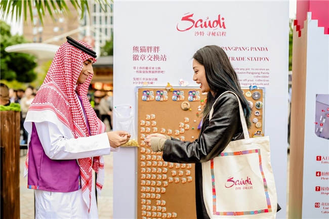 在“沙特小镇”现场,限量版“熊猫胖胖”沙特主题徽章成为最受欢迎的互动项目。游客只需携带任意一枚旧徽章,即可免费兑换每日限量的“沙特限定”熊猫徽章。该系列徽章以沙特六大目的地——利雅得、吉达、红海、德拉伊耶、埃尔奥拉和沙特标志为主题,六款徽章可拼合成一幅完整的探索地图。这一活动不仅是物品的交换,更象征旅行记忆的传递与旅程的延续,吸引众多游客将这份独特的沙特记忆珍藏回家。