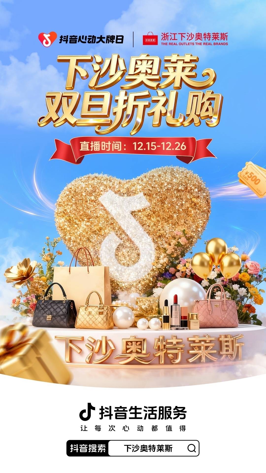 为响应这份对美好生活的向往,2025年12月14日至12月26日,全国头部奥莱商场——浙江下沙奥莱,携手「抖音心动大牌日」IP,共同开启“双旦折礼购”跨年购物节。线上,通过明星与超头达人直播释放声量,推出“年度精选货盘”;线下,打造沉浸式跨年打卡活动,汇聚人气。这场深度联动,为消费者构筑了一个从线上种草到线下体验的完整节日消费旅程,让为新年准备的每一份心意,都满载惊喜。