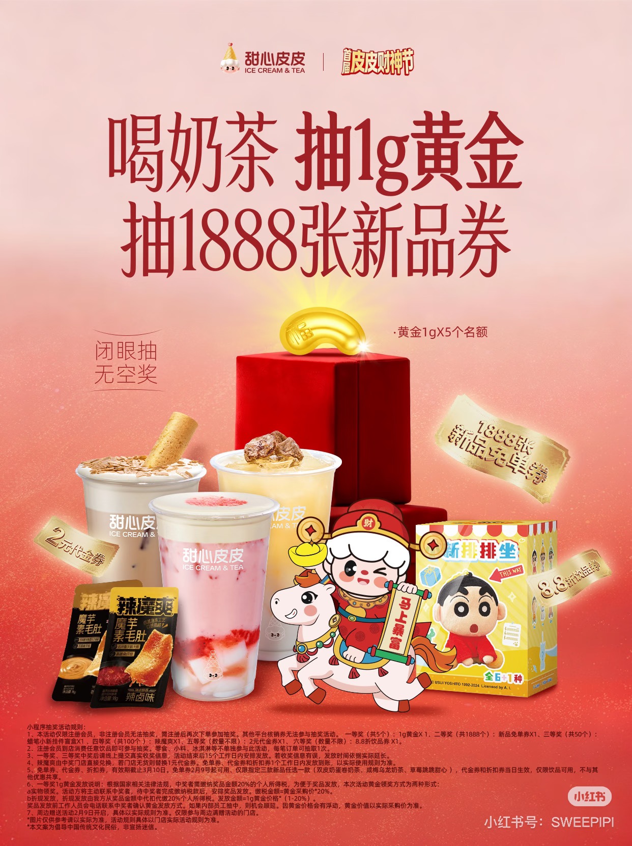 如果说新产品满足了味蕾,那么同步开启的“皮皮财神节”,则旨在温暖人心。活动期间,消费者购买特定产品即有机会刮出“1g真黄金”大奖或获得“1888张新品免单券”,但甜心皮皮希望传递的核心信息远不止于此。