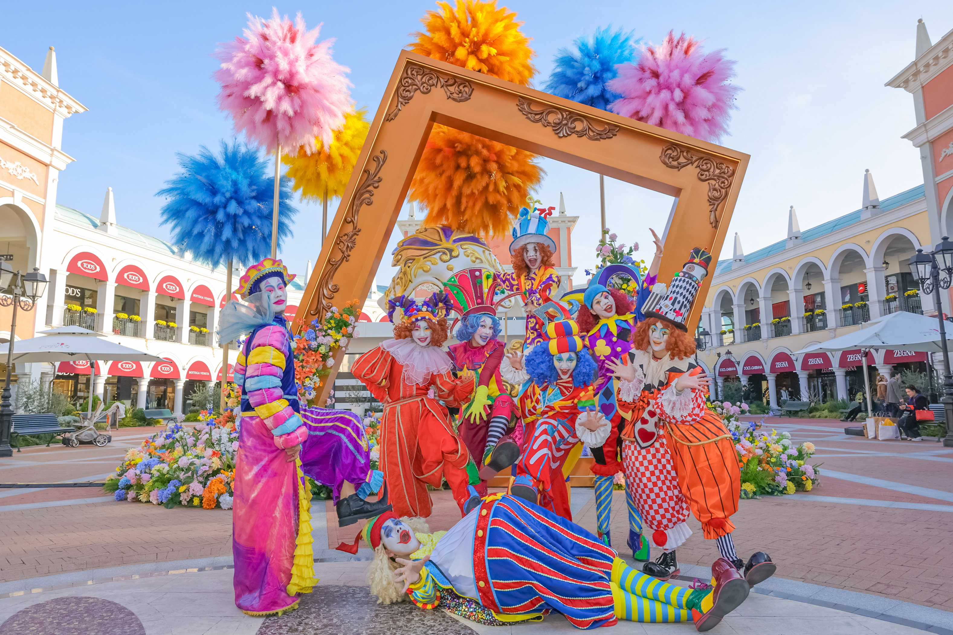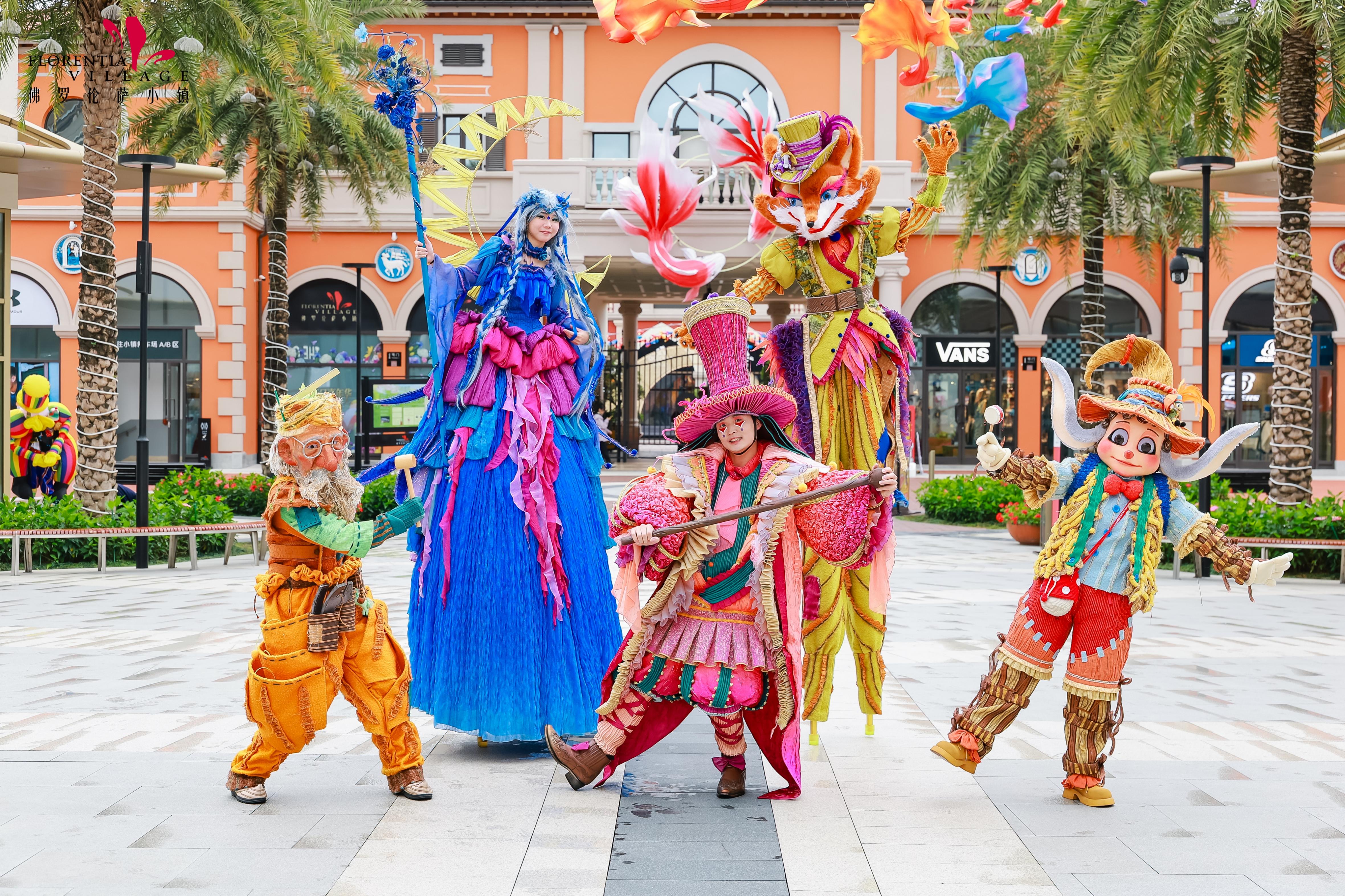 活动期间,意大利狂欢节的经典元素被创新融入意式建筑空间。巨型复古油画框装置点缀着神秘的狂欢节面具,与层叠倾泻的繁花瀑布相映成趣,筑就一派春意盎然的嘉年华氛围。此外,承袭地道的意式节庆传统,各小镇化身流动的艺术舞台:广佛FV佛罗伦萨小镇邀请曾参演乌镇戏剧节的《木偶奇遇记》原版剧组,将经典童话与高跷歌剧巡演相融,把高水准的街头艺术带入购物街区;上海FV佛罗伦萨小镇则以身着狂欢节传统华服与面具的沉浸式演出再现节日盛况,并邀请现场观众参与即兴互动,于娱购间隙邂逅纯正的意式狂欢节体验。