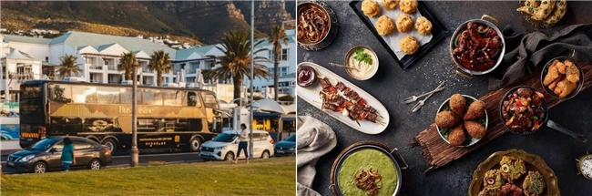 南非首家豪华双层移动餐厅,由双层巴士改造而成,主打精致的六道菜式用餐体验。黄昏时分,巴士从开普敦市中心出发,沿着海岸线一路向南行驶至豪特湾,城市街景与海湾落日尽收眼底。窗外是染着金光的十二门徒峰,车内木质座椅、柔和灯光,配有稳固防洒的酒杯架。菜单选用当季新鲜食材,将南非风味融入每一道精致菜品中。