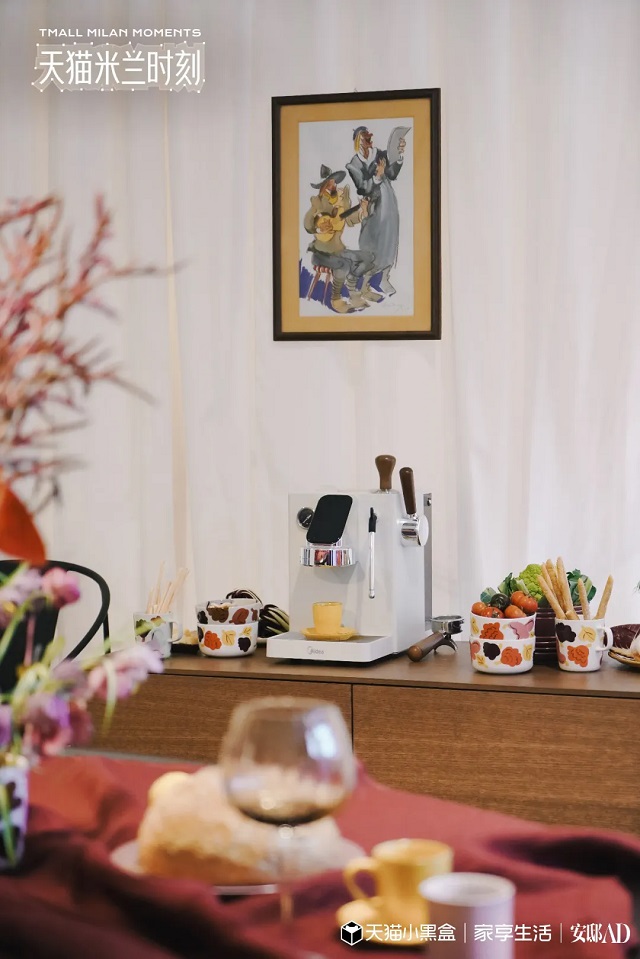 在「疗愈型卧室」这一展厅中,来自米兰当地的陶土灰砖、花砖围合出一个简洁复古风的床架,与水星家纺夏凉雪糕床品套组相呼应,展示了品牌的夏日睡眠解决方案;而在「沉浸式客餐厅」里,美的可爱多咖啡机、美的花瓣 PRO 电饭煲与精致的意式早餐一起,让美好早晨的想象,立刻跃然于屏幕之上。